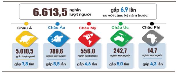 Cụ thể, khách quốc tế đến Việt Nam tháng 7/2023 ước đạt hơn 1 triệu lượt người, tăng 6,5% so với tháng trước và gấp 2,9 lần cùng kỳ năm trước. Lũy kế 7 tháng đầu năm 2023, khách quốc tế đến Việt Nam ước đạt hơn 6,6 triệu lượt người, gấp 6,9 lần so với cùng kỳ.