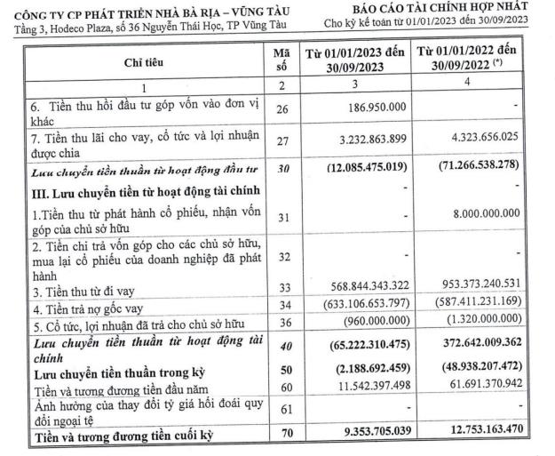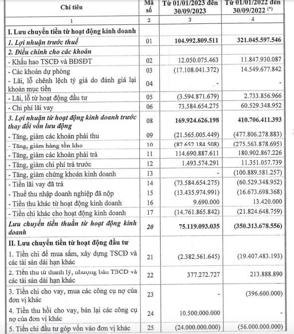 Mặc dù kinh doanh lao dốc nhưng trong 9 tháng đầu năm 2023, Công ty Hodeco ghi nhận dòng tiền kinh doanh chính dương 75,1 tỷ đồng, so với cùng kỳ âm 350,3 tỷ đồng. Ngoài ra, dòng tiền đầu tư ghi nhận âm 12,1 tỷ đồng và dòng tiền tài chính ghi nhận âm 65,2 tỷ đồng.