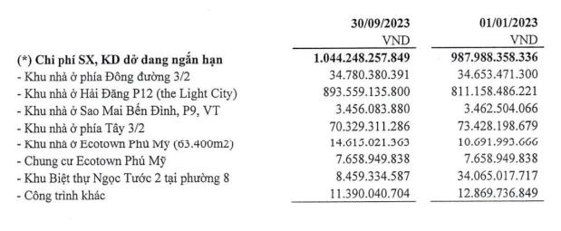 Chi phí sản xuất, kinh doanh dở dang ngắn hạn hơn 1.044 tỷ đồng, bao gồm các dự án đáng chú ý như khu nhà ở Sao Mai Bến Đình, phường 9, Vũng Tàu với 893,5 tỷ đồng; dự án khu nhà ở phía Tây 3/2 hơn 70 tỷ đồng; dự án khu nhà ở Ecotown Phú Mỹ trị giá 14,6 tỷ đồng và các dự án khác.