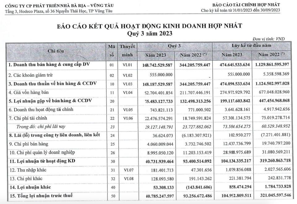 Công ty cổ phần Phát triển Nhà Bà Rịa - Vũng Tàu (Hodeco, mã ck: HDC) mới đây đã công bố báo cáo tài chính quý III/2023 với doanh thu thuần ở mức 168,1 tỷ đồng, giảm 51,1% so với cùng kỳ năm trước.