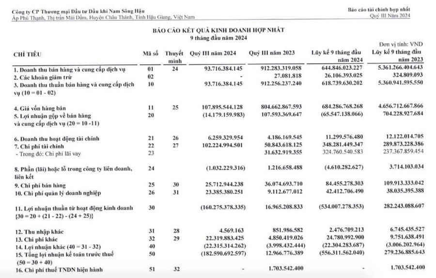 Theo báo cáo tài chính quý III/2024 mới công bố, trong quý III, Công ty cổ phần Thương mại Đầu tư Dầu khí Nam Sông Hậu (mã ck: PSH) ghi nhận doanh thu thuần đạt 93,7 tỷ đồng, giảm 90% so với cùng kỳ năm ngoái.