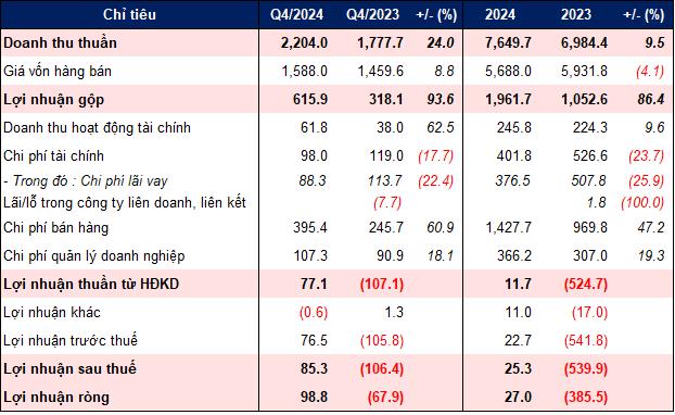Sau cùng, MML lãi ròng gần 99 tỷ đồng trong quý IV/2024, đánh dấu quý thứ hai liên tiếp có lãi sau chuỗi thua lỗ kéo dài từ quý I/2022. Lũy kế cả năm, Công ty lãi ròng 27 tỷ đồng.