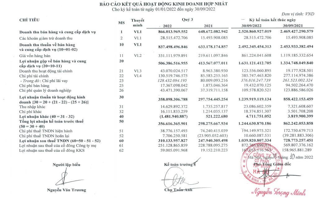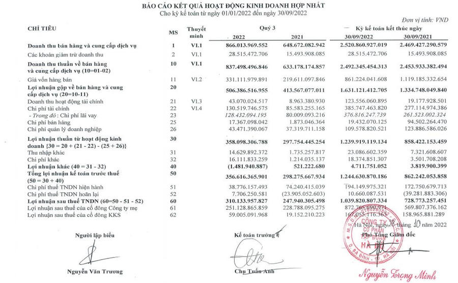 Lũy kế 9 tháng đầu năm 2022, doanh nghiệp thu về 2.502 tỷ đồng doanh thu thuần, tăng gần 2% so với mức 2.469 tỷ đồng vào cùng kỳ năm ngoái.