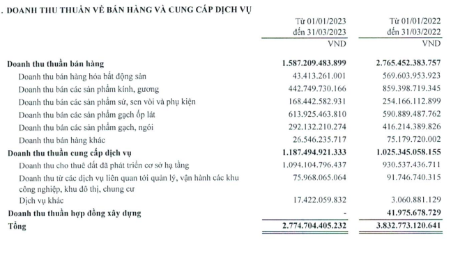 Trong đó, doanh thu thuần đến việc bán hàng về 1.587 tỷ đồng, giảm 43%. Sản phẩm gạch ốp lát là bộ phận chiếm tỷ trọng lớn nhất trong quý I với doanh thu đạt gần 614 tỷ đồng. Đây cũng là mảng duy nhất tăng trưởng doanh thu so với cùng kỳ.