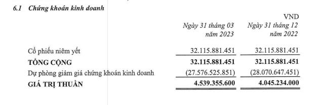 Đáng chú ý, TDH dành ra khoản lớn đầu tư cổ phiếu dưới dạng chứng khoán kinh doanh. Ở thời điểm cuối tháng 3, khoản mục này hiển thị trên báo cáo tài chính có giá gốc là hơn 32 tỷ đồng, nhưng đang phải trích lập dự phòng giảm giá tới 27,6 tỷ đồng, tương đương mức lỗ khoảng 86%.