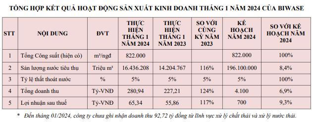 Tháng đầu năm, tổng doanh thu BWE ước đạt 281 tỷ đồng và lãi sau thuế hơn 65 tỷ đồng, tăng tương ứng 24% và 17% so với cùng kỳ.