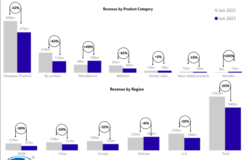 Về cơ cấu doanh thu, mảng cá tra vẫn tiếp tục suy giảm, với mức giảm 22% còn 475 tỷ đồng, đóng góp 56% vào doanh thu chung của công ty. Các sản phẩm phụ, chăm sóc sức khỏe và sản phẩm giá trị gia tăng cũng sụt giảm, lần lượt giảm 43%, 42% và 15%.