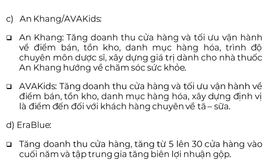 Còn với, AVAKids, ban lãnh đạo dự kiến tăng doanh thu cửa hàng và tối ưu vận hành về điểm bán, tồn kho, danh mục hàng hóa, xây dựng định vị là điểm đến với khách hàng chuyên về tã - sữa.