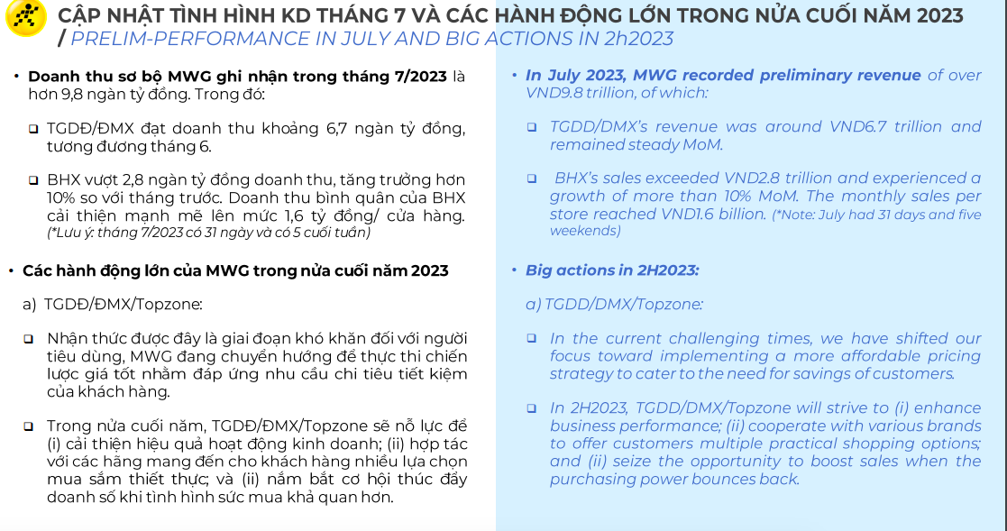 Về kế hoạch kinh doanh nửa cuối năm, Thế Giới Di Động, Điện Máy Xanh và Topzone vẫn đang thực thi chiến lược giá tốt để đáp ứng nhu cầu tiết kiệm của khách hàng. Ngoài ra, ban lãnh đạo công ty cũng nhận định đây vẫn là giai đoạn khó khăn của người tiêu dùng.