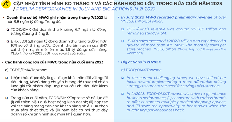 Doanh thu tháng 7/2023 của Thế giới Di Động (MWG) giảm 11%, tiếp tục chiến lược giá thấp nửa cuói năm