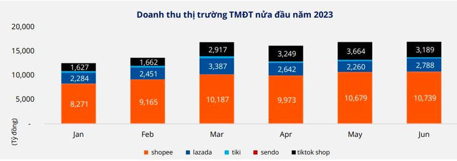 TikTok Shop đạt doanh thu 16.300 tỷ đồng, bằng 27% so với thành tích của Shopee, với 117 triệu sản phẩm bán ra. Trong khi đó, Lazada đạt 15.700 tỷ đồng doanh thu NMV với 117,5 triệu sản phẩm.
