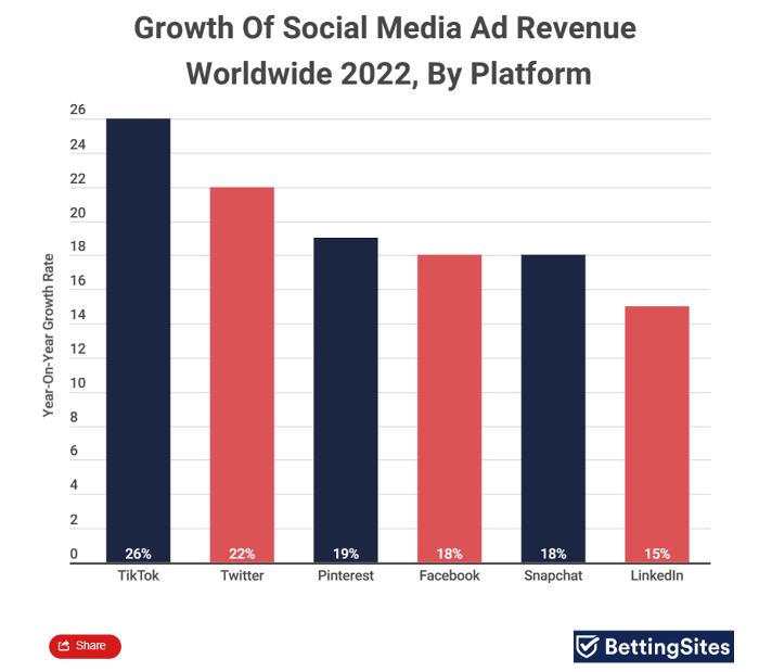 Ứng dụng truyền thông mạng xã hội thuộc sở hữu của công ty Trung Quốc, ByteDance, không chỉ báo cáo doanh thu từ quảng cáo trong năm 2022 tăng 26% so với cùng kỳ năm ngoái mà TikTok còn được dự đoán sẽ chứng kiến doanh thu từ quảng cáo tăng gấp đôi lên 7,4 tỷ USD trong 4 năm tới.