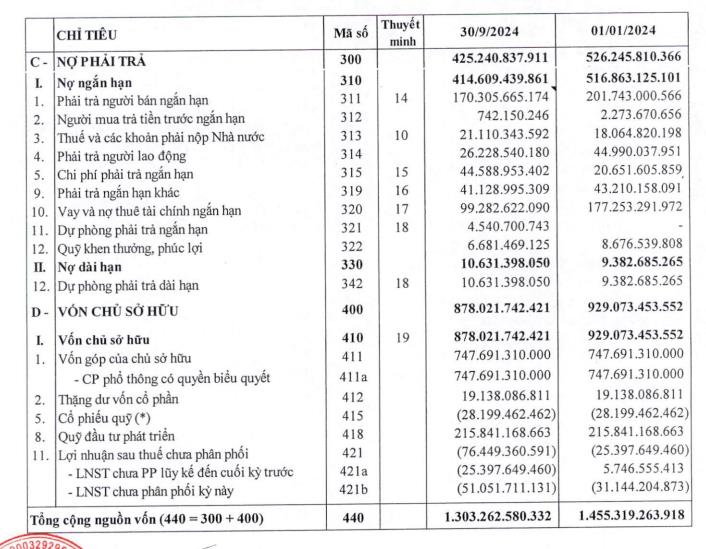 Hàng tồn kho giảm từ 227,4 tỷ đồng thời điểm đầu năm về mức 155,1 tỷ đồng ở cuối quý III/2024.