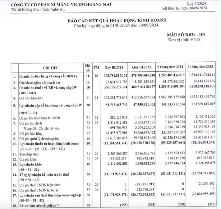 Đối mặt với nhiều khó khăn, Vicem Hoàng Mai (HOM) báo lỗ hơn 11 tỷ đồng trong quý III/2024