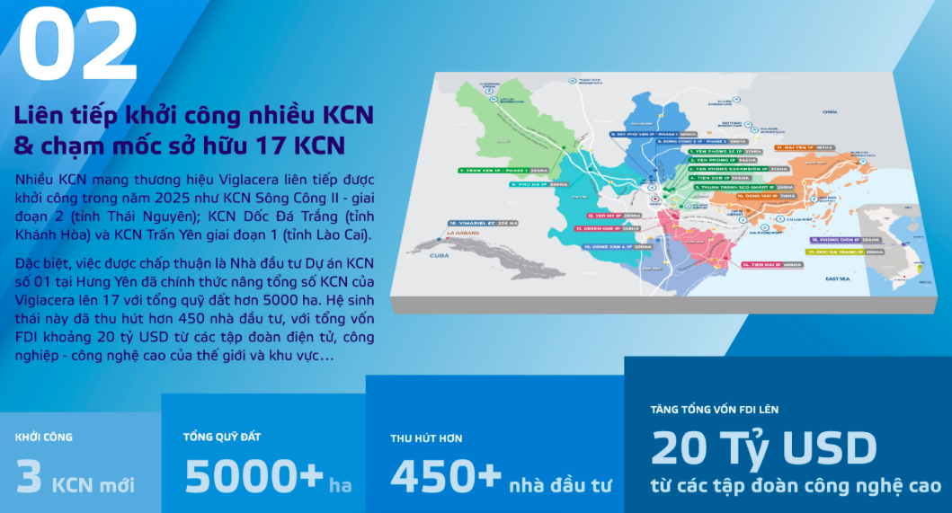 Trong năm 2025, Viglacera tiếp tục đẩy mạnh mảng bất động sản khu công nghiệp với việc liên tiếp khởi công nhiều KCN mới, gồm KCN Sông Công II – giai đoạn 2 (Thái Nguyên), KCN Dốc Đá Trắng (Khánh Hòa) và KCN Trấn Yên giai đoạn 1 (Lào Cai).