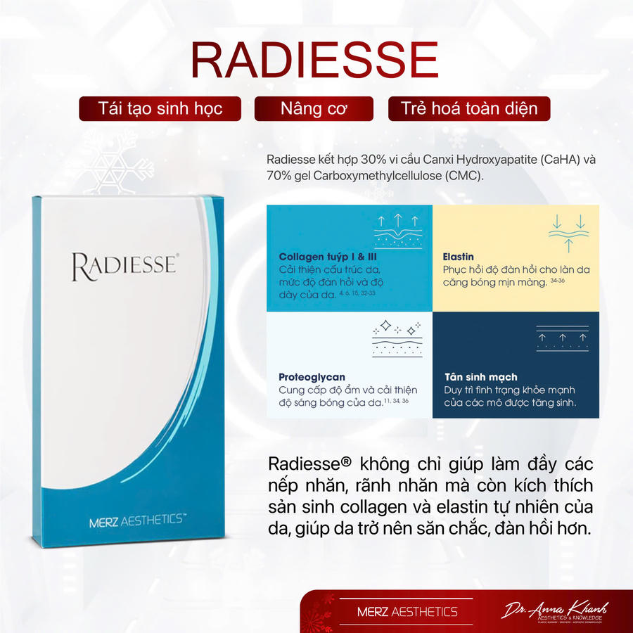 Radiesse chứa 30% vi cầu Calcium Hydroxylapatite (CaHA) phân tán trong 70% gel nền CMC, không chỉ tạo hiệu ứng nâng đỡ ban đầu mà còn kích thích tăng sinh collagen nội sinh, giúp tái cấu trúc da bền vững theo thời gian. Sản phẩm đã được FDA Hoa Kỳ chấp thuận từ năm 2006, là một trong những giải pháp trẻ hóa sinh học có dữ liệu lâm sàng lâu dài trên toàn cầu.