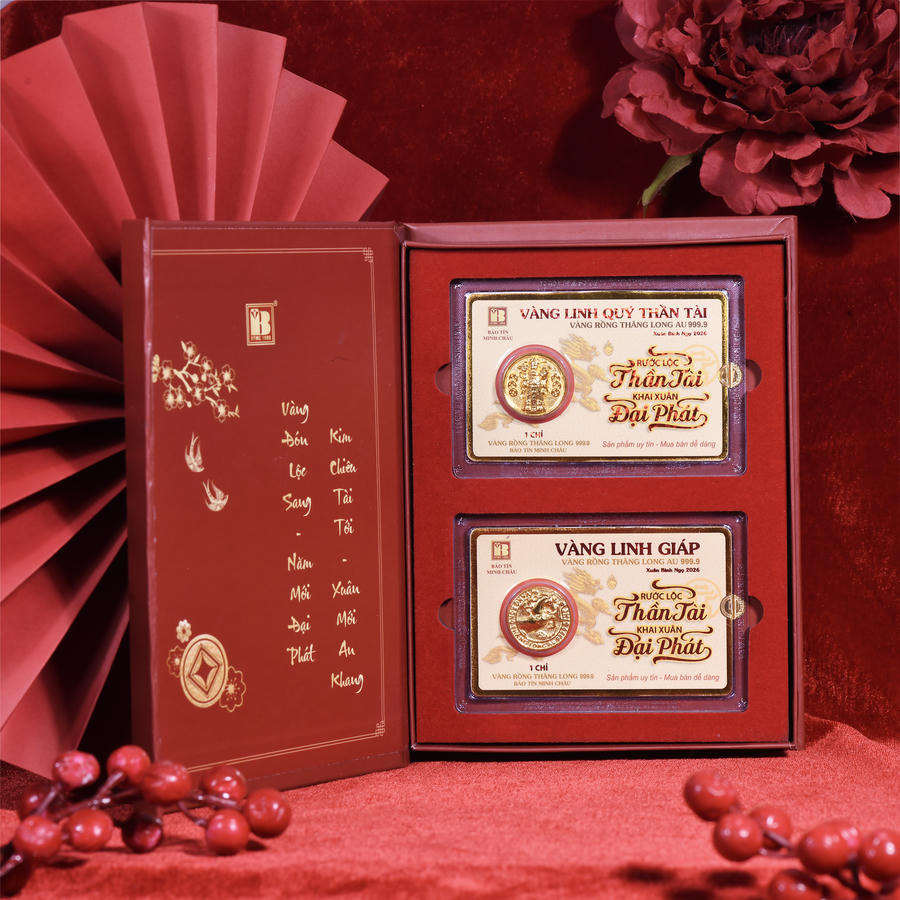 Vỉ vàng Linh giáp, Linh quý Thần Tài được chế tác từ Vàng Rồng Thăng Long 999.9 (vàng 24K) cầu tài, giữ lộc, bình an và hanh thông trong công việc, kinh doanh, phù hợp để tích lũy đầu năm hoặc làm quà biếu sang trọng.