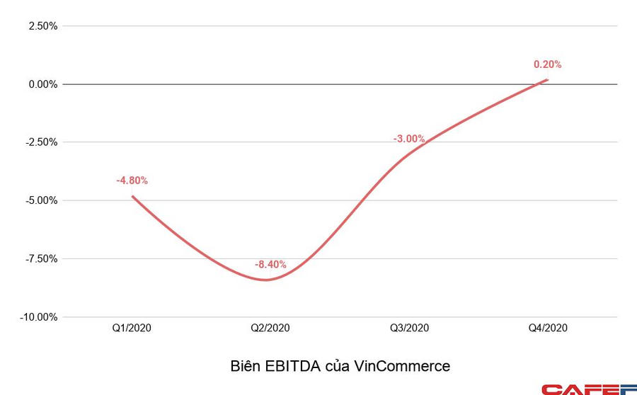 Trên thực tế, biên EBITDA của VinCommerce đã rơi xuống mức âm 8,4% trong quý 2 trước lệnh giãn cách xã hội, so với mức âm 4,8% của quý đầu năm. Chỉ số này được cải thiện mạnh mẽ xuống mức âm 3% trong quý 3, trước khi dương vào quý cuối năm như kế hoạch.