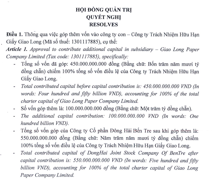 Ngày 03/02/2026, CTCP Đông Hải Bến Tre (mã ck: DHC) thông qua việc góp thêm 100 tỷ đồng vào công ty con là Công ty TNHH Giấy Giao Long.