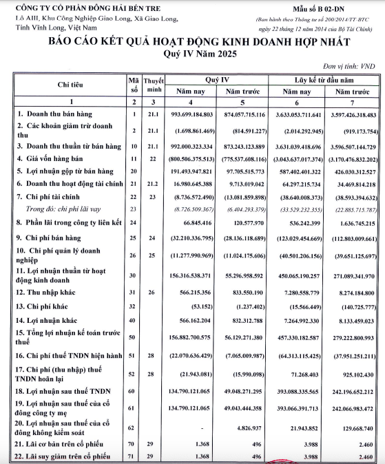 Về bức tranh tài chính, theo báo cáo kinh doanh quý IV/2025, doanh nghiệp ghi nhận doanh thu thuần đạt 992 tỷ đồng, tăng 14% so với cùng kỳ năm trước.