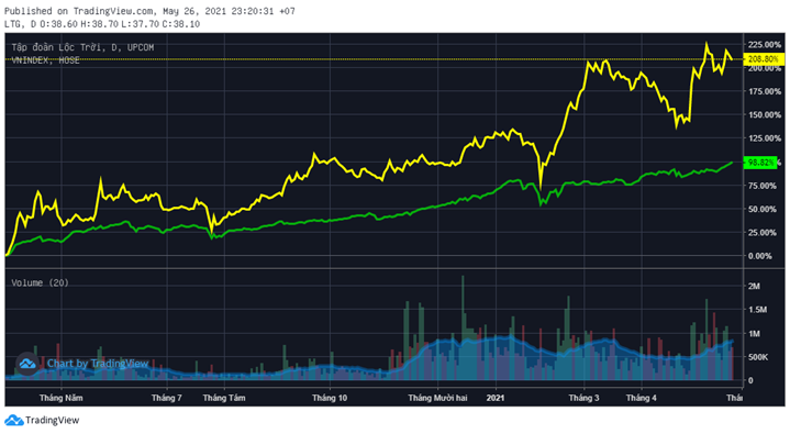 LTG liên tục tăng mạnh trong hơn 1 tháng sau qua đó đạt đỉnh nhiều năm tại 37.900 đồng/cổ phiếu trước khi điều chỉnh sâu. Cổ phiếu này tăng trở lại từ cuối tháng 4 và không mất nhiều thời gian để vượt đỉnh cũ. Hiện LTG đang tích lũy quanh mức 38.000 đồng/cổ phiếu, tăng 73% sau chưa đến 4 tháng.