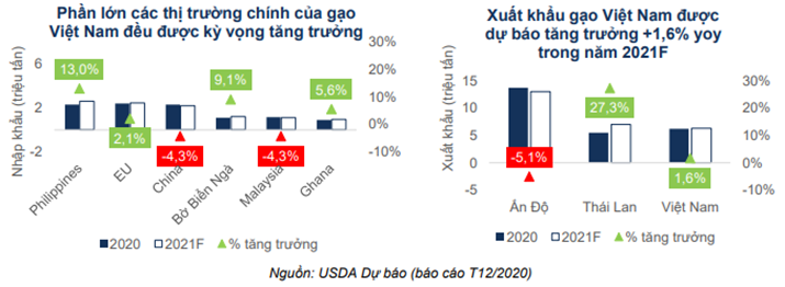 Trong năm 2021, Chứng khoán FPTS cho rằng ngành lúa gạo Việt Nam sẽ tiếp tục ổn định, kỳ vọng doanh thu toàn ngành tăng trưởng ở mức 1,6% so với năm trước nhờ sản xuất phục hồi trong điều kiện thời tiết thuận lợi.