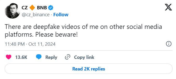 Cảnh báo này liên quan đến các video deepfake, trong đó CZ quảng bá tiền điện tử. Zhao kêu gọi người dùng hãy cẩn thận và đừng mắc bẫy. CZ chỉ rõ rằng ông thấy những video deepfake này đang lan truyền trên các nền tảng mạng xã hội khác, nhưng không phải trên X.