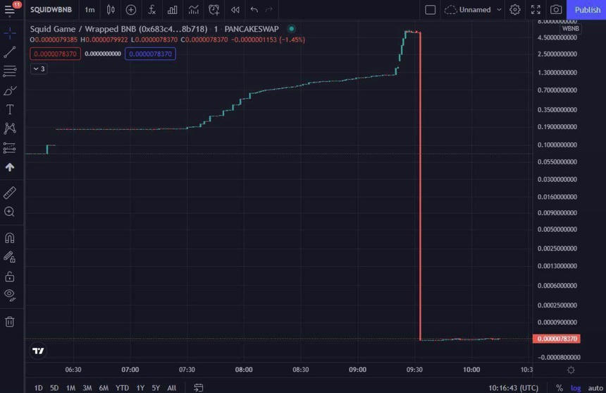 Đơn cử như đồng Squid - đồng tiền số ra đời lấy cảm hứng từ bộ phim Squid Game nổi đình đám trên Netflix. Squid đã tăng tới 230.000% lên 2.861,8 USD trong tuần qua, theo định giá của CoinMarketCap. Tuy nhiên, trong ngày 1/11, chỉ trong vài phút, giá Squid đã "bốc hơi" gần 100% giá trị, xuống còn 0,0007926 USD. Thứ hạng hiện tại trên CoinMarketCap của Squid #2762, với vốn hóa thị trường là không xác định.