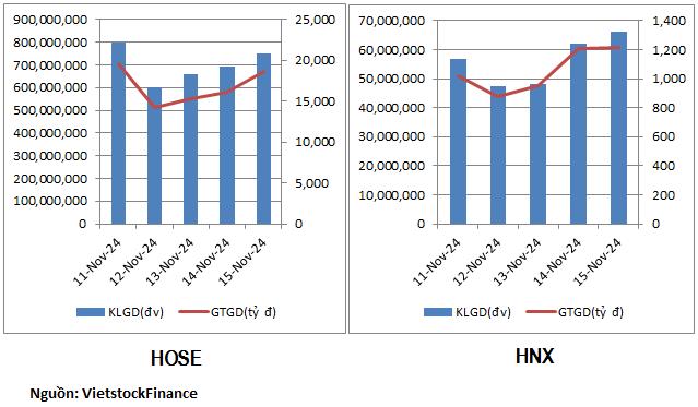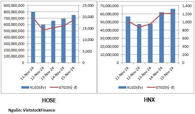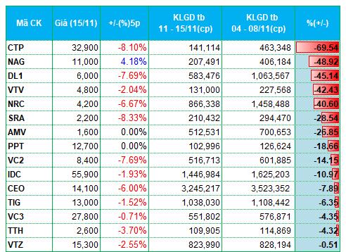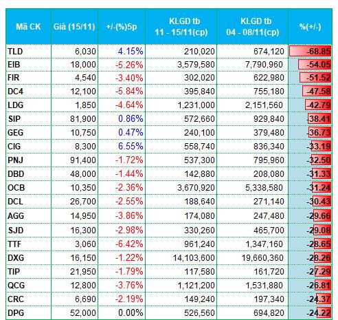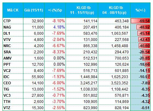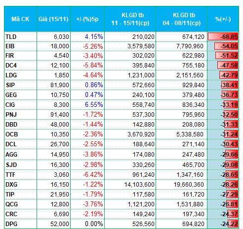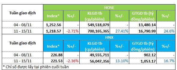 Tuần 11 - 15/11, thị trường rơi vào pha giảm điểm khi chỉ số hai sàn HOSE và HNX đồng loạt giảm tên 2% về còn 1,218.57 điểm và 221.53 điểm. Thanh khoản lại biến động ngược chiều với điểm số. Ở sàn HOSE, khối lượng giao dịch bình quân tăng 27% lên hơn 700 triệu đơn vị/phiên. Giá trị giao dịch tăng 24% lên 16.79 ngàn tỷ đồng/phiên.