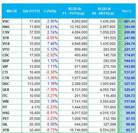 Các mã như VOS, VTO, VIP cũng có thanh khoản tăng bằng lần so với tuần trước. Ở sàn HNX, DXP cũng lọt top tăng thanh khoản mạnh trong tuần với khối lượng giao dịch tăng 200%, đat 862 ngàn đơn vị trên phiên.