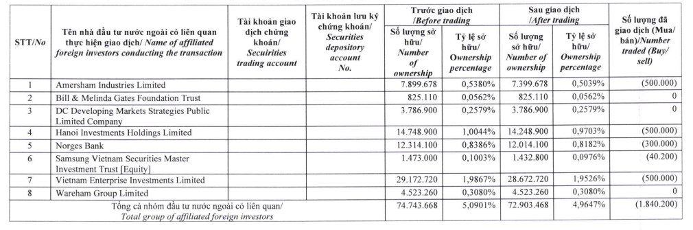Ngoài ra, quỹ Norges Bank bán ra 300.000 cổ phiếu; và quỹ Samsung Vietnam Securities Master Investments Trust (Equity) bán ra 40.200 cổ phiếu.