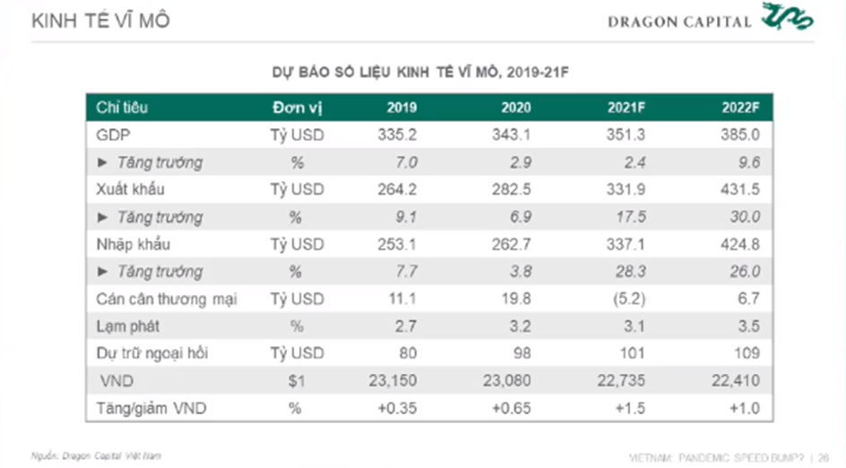 Dragon Capital dự báo tăng trưởng GDP năm 2021 sẽ ở mức 2,4%, thấp hơn khoảng 0,6 - 1% so với các tổ chức trong và ngoài nước. Quý 3 chắc chắn sẽ tăng trưởng âm do 6 tỉnh thành phía Nam và Hà Nội (đóng góp 40-45% GDP cả nước) đã phải đóng cửa trong thời gian khoảng 2-3 tháng. Dù vậy, tăng trưởng thấp trong năm nay sẽ tạo dư địa cho năm sau có thể tăng mạnh hơn với dự báo khoảng 8,5 - 9,6% cho năm 2022.