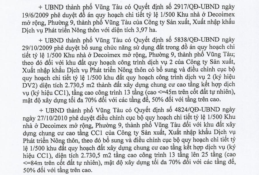 Cụ thể, từ năm 2009 - 2010, UBND TP Vũng Tàu đã lần lượt có các quyết định điều chỉnh quy hoạch chi tiết tỷ lệ 1/500 khu nhà ở Decoimex mở rộng: Quyết định số 2917/QĐ-UBND ngày 19/6/2009 phê duyệt quy hoạch chi tiết tỷ lệ 1/500 Khu nhà ở Decoimex mở rộng; Quyết định số 5838/QĐ-UBND ngày 29/10/2009 phê duyệt bổ sung chức năng sử dụng đất khu đất công trình dịch vụ 2 thành đất xây dựng chung cư cao tầng kết hợp dịch vụ, với tầng cao 13 tầng; Quyết định số 4824/QĐ-UBND ngày 27/10/2010 điều chỉnh cục bộ quy hoạch với tầng cao công trình tăng lên 25 tầng, mật độ xây dựng tối đa cũng được điều chỉnh.