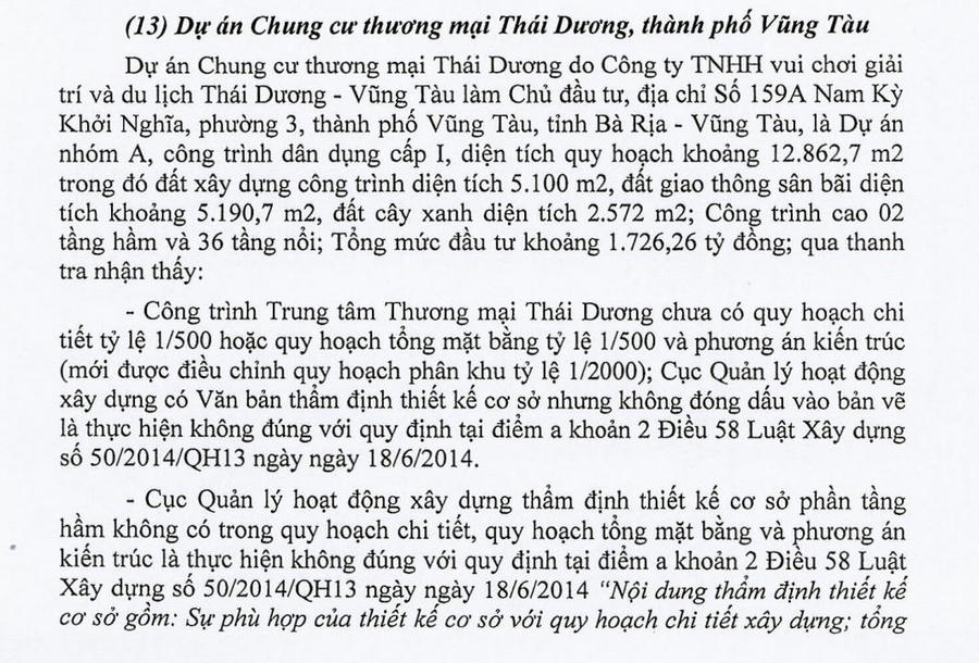 Theo Kết luận thanh tra số 81/KL-TTCP của Thanh tra Chính phủ về trách nhiệm quản lý nhà nước trong công tác quy hoạch và thực hiện quy hoạch của Bộ Xây dựng, một số vi phạm tại các dự án trên địa bàn tỉnh Bà Rịa - Vũng Tàu đã được chỉ ra. Trong đó, có dự án Chung cư thương mại Thái Dương do Công ty TNHH Vui chơi Giải trí và Du lịch Thái Dương - Vũng Tàu làm chủ đầu tư.
