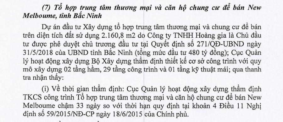 Ngoài ra, Cục Quản lý hoạt động xây dựng ban hành văn bản nhưng không kết luận dự án Tổ hợp trung tâm thương mại và căn hộ chung cư để bán New Melboume chưa đủ điều kiện (hoặc đủ điều kiện) triển khai các bước tiếp theo là thực hiện không đúng với quy định tại mẫu số 03 Phụ lục II Nghị định số 59/NĐ-CP ngày 18/6/2015 của Chính phủ và khoản 1 Điều 9 Thông tư số 18/2016/TT-BXD ngày 30/6/2016 của Bộ Xây dựng.