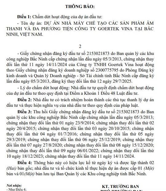 UBND tỉnh Bắc Ninh, Ban Quản lý các khu công nghiệp tỉnh Bắc Ninh ngày 4/9/2025 đã ban hành thông báo số 62/TB-BQLCKCN về việc chấm dứt hoạt động dự án nhà máy chế tạo các sản phẩm âm thanh và đa phương tiện công ty Goertek Vina tại Bắc Ninh.