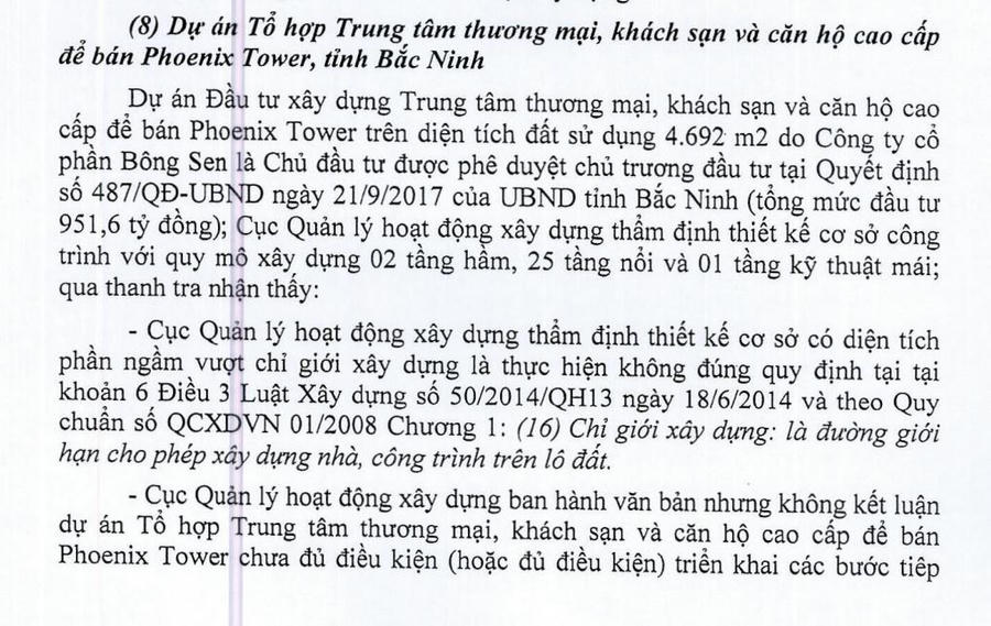 Bên cạnh đó, Cục Quản lý hoạt động xây dựng ban hành văn bản nhưng không kết luận Phoenix Tower Bắc Ninh chưa đủ điều kiện (hoặc đủ điều kiện) triển khai các bước tiếp theo là thực hiện không đúng với quy định tại mẫu số 03 Phụ lục II Nghị định số 59/NĐ-CP ngày 18/6/2015 của Chính phủ và khoản 1 Điều 9 Thông tư số 18/2016/TT-BXD ngày 30/6/2016 của Bộ Xây dựng.