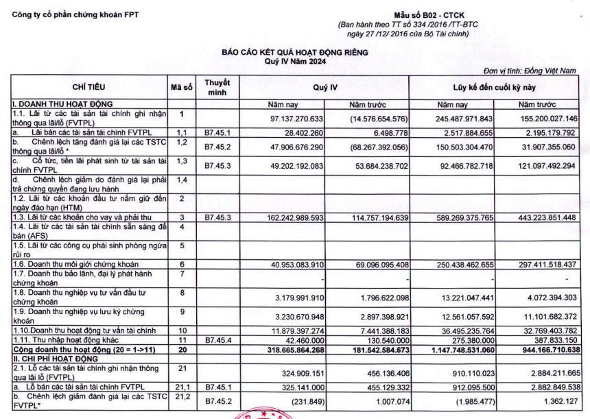 Về tình hình kinh doanh, trong quý IV/2024, FPTS đạt 318,6 tỷ đồng doanh thu hoạt động, tăng trưởng 75% so với cùng kỳ.