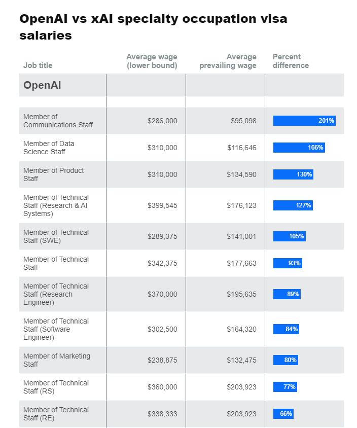 Dữ liệu lương từ các hồ sơ xin thị thực lao động đặc biệt (H-1B) đã hé lộ mức lương khổng lồ mà hai công ty này chi trả để thu hút nhân tài. Theo phân tích của Business Insider, cả xAI và OpenAI đều trả lương cao hơn nhiều so với mức trung bình ngành, nhưng OpenAI thậm chí trả cao hơn đáng kể.