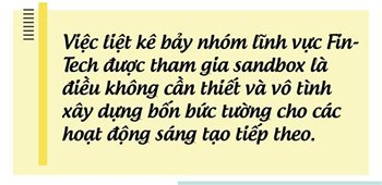 Thứ hai, việc liệt kê bảy nhóm lĩnh vực FinTech được tham gia sandbox là điều không cần thiết và vô tình xây dựng bốn bức tường cho các hoạt động sáng tạo tiếp theo. Chưa kể, bảy lĩnh vực được liệt kê trong dự thảo cũng không bao quát hết các hoạt động của FinTech đang tồn tại trên thực tế. Chúng tôi cho rằng, sandbox cần phải lấy nguyên tắc tôn trọng quyền tự do kinh doanh - công dân được quyền làm những gì pháp luật không cấm làm trụ cột. Vì vậy, sandbox không cần giới hạn lĩnh vực mà chỉ cần xây dựng tiêu chí và xác định những “vùng cấm địa” để bảo vệ những giá trị công cộng.