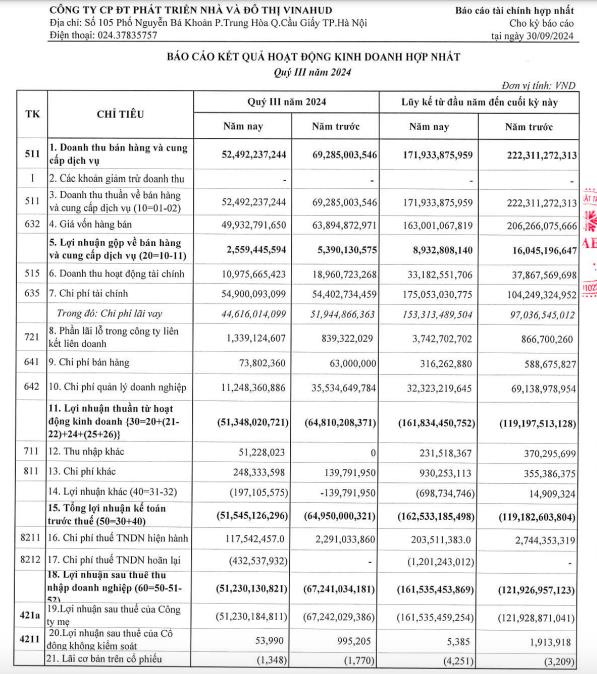 Công ty cổ phần Đầu tư Phát triển Nhà và Đô thị Vinahud (mã ck: VHD) vừa công bố kết quả kinh doanh hợp nhất quý III/2024 với kết quả không mấy khả quan.