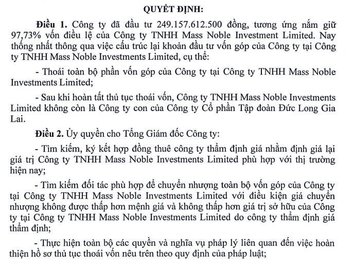 Đức Long Gia Lai đã đầu tư hơn 249 tỷ đồng để trở thành công ty mẹ của Mass Noble Investments Limited, tương ứng nắm giữ đến 97,73% vốn đơn vị. Đến nay, Hội đồng quản trị thống nhất sẽ thoái toàn bộ phần vốn góp tại công ty thành viên này.