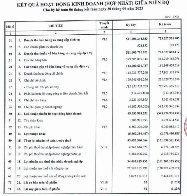 Về tình hình kinh doanh, theo báo cáo soát xét bán niên 2023 của DLG, công ty ghi nhận doanh thu thuần đạt 511,6 tỷ đồng, giảm 29,2% so với cùng kỳ năm 2022.