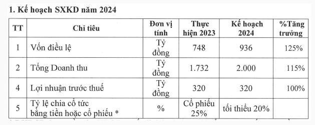 Năm 2024, công ty đặt kế hoạch doanh thu tăng 15% lên 2.000 tỷ đồng, nhưng lợi nhuận trước thuế giữ nguyên so với thực hiện năm trước ở mức 320 tỷ đồng.