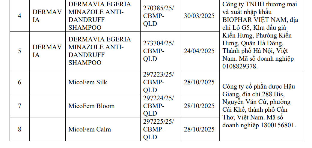 Danh mục bị thu hồi bao gồm các sản phẩm dầu gội, bọt vệ sinh và dung dịch vệ sinh do bốn doanh nghiệp chịu trách nhiệm đưa ra thị trường. Trong đó có ba sản phẩm MicoFem Silk, MicoFem Bloom và MicoFem Calm của Công ty CP Dược Hậu Giang; sản phẩm Piajour Woman Body Foam của Công ty TNHH Thương mại HKK; hai sản phẩm Dermavia Egeria Minazole Anti-Dandruff Shampoo do Công ty TNHH Thương mại và Xuất nhập khẩu BIOPHAR Việt Nam phân phối; cùng hai sản phẩm mang nhãn hiệu Biorga Cystiphane do Công ty CP Dược phẩm TEDIS - Việt Hà chịu trách nhiệm.