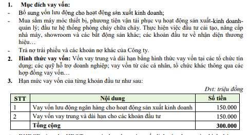Trong đó, vay vốn lưu động ngân hàng cho hoạt động sản xuất kinh doanh 150 tỷ đồng; vay vốn vay trung và dài hạn cho các khoản đầu tư 150 tỷ đồng.