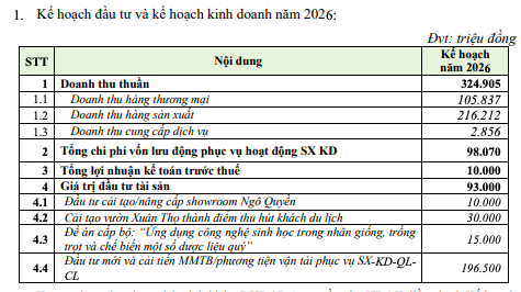 Về kế hoạch đầu tư năm 2026, doanh nghiệp dự kiến chi 10 tỷ đồng để đầu tư cải tạo/nâng cấp showroom Ngô Quyền; cải tạo vườn Xuân Thọ thành điểm thu hút khách du lịch 30 tỷ đồng. Đồng thời, doanh nghiệp dự chi 15 tỷ đồng để đầu tư làm Đề án cấp bộ: “Ứng dụng công nghệ sinh học trong nhân giống, trồng trọt và chế biến một số dược liệu quý”.