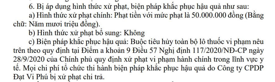 Với vi phạm trên, Dược phẩm Đạt Vi Phú bị phạt tiền 50 triệu đồng. Đồng thời, doanh nghiệp bị buộc tiêu hủy toàn bộ lô thuốc vi phạm chất lượng, mọi chi phí liên quan đến việc tiêu hủy do công ty tự chi trả theo quy định của pháp luật.