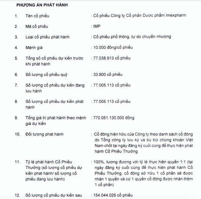 Đối với phương án phát hành thưởng, Imexpharm sẽ thực hiện theo tỷ lệ 100% (cổ đông sở hữu 01 cổ phiếu cũ được nhận 01 cổ phiếu mới). Tổng khối lượng phát hành là hơn 77 triệu cổ phiếu, qua đó tăng vốn điều lệ lên khoảng 1.540 tỷ đồng.
