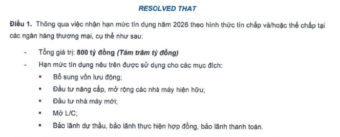 Theo đó, Imexpharm đã thông qua việc nhận hạn mức tín dụng năm 2026 với tổng giá trị 800 tỷ đồng theo hình thức tín chấp và/hoặc thế chấp tại các ngân hàng thương mại.
